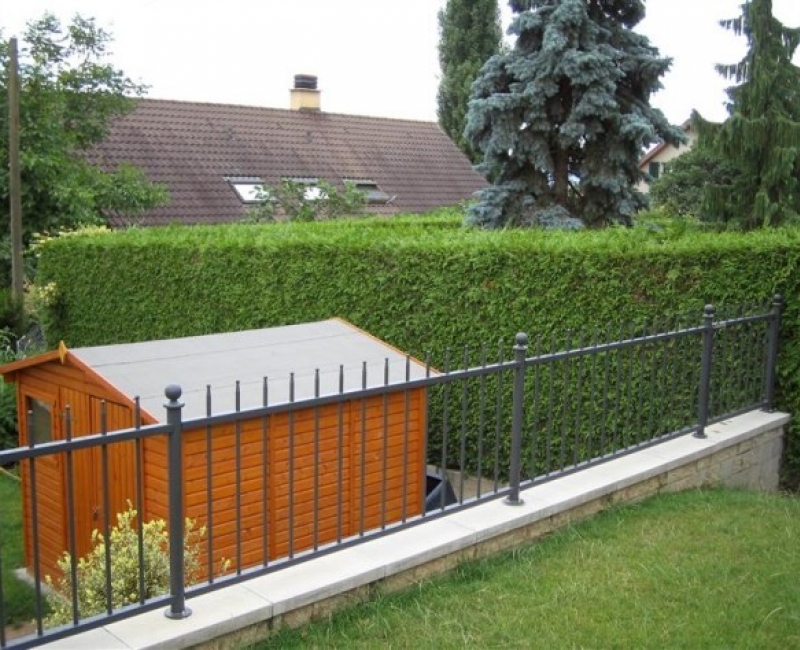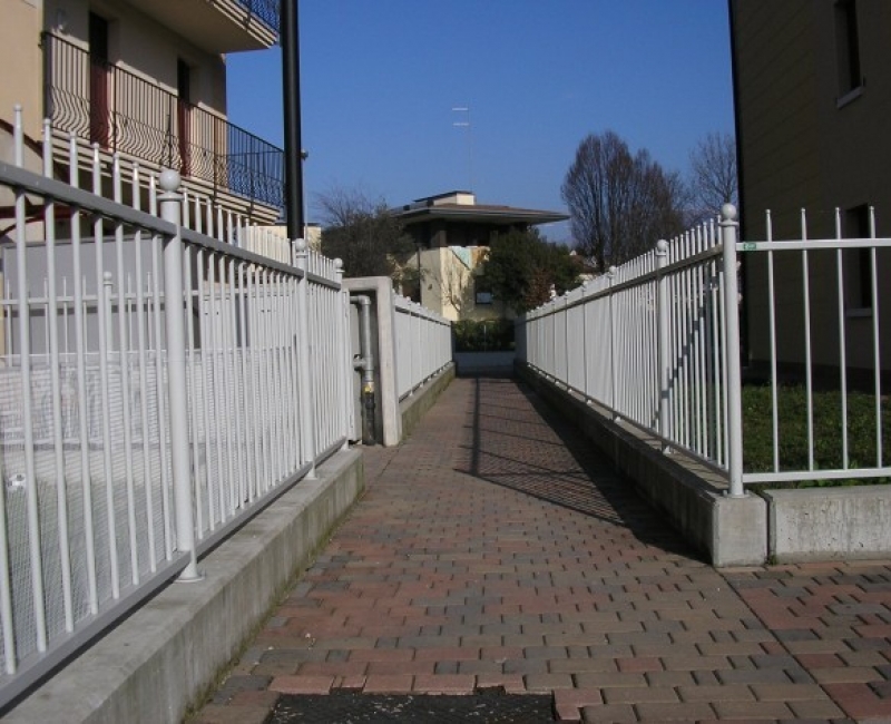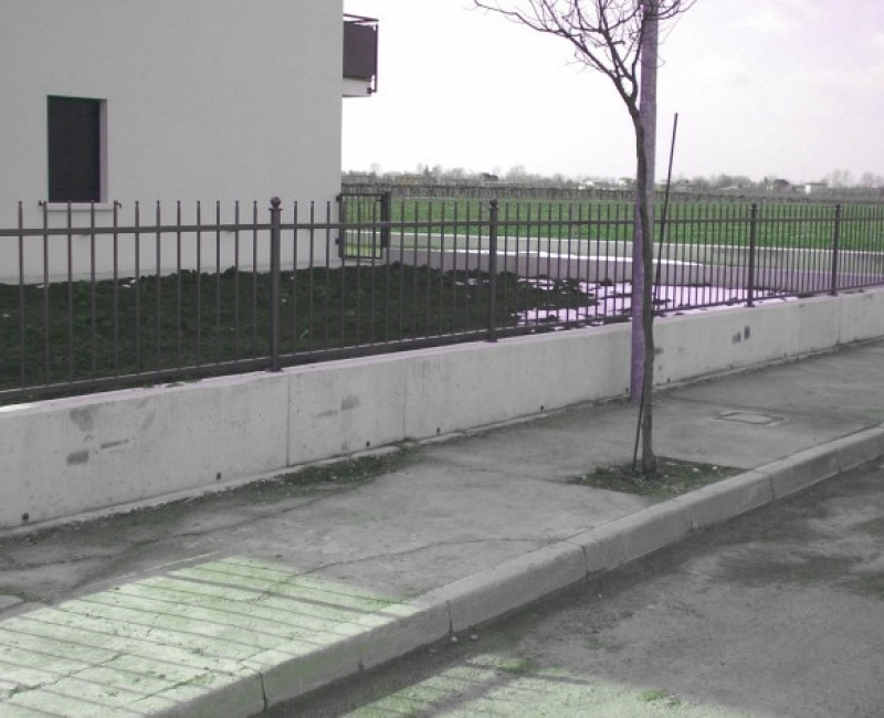 profili orizzontali a forma di C da mm 40x30, spessore mm 1,5; piantoni di sostegno in tubo tondo da mm 50 x spessore mm 2 con piastra di fissaggio tonda da mm 100 x 6 posti ad interasse di mm 2000, Altezze standard mm 850 - 1050 - 1250; zincate e verniciate a polveri poliestere tinte RAL a scelta.